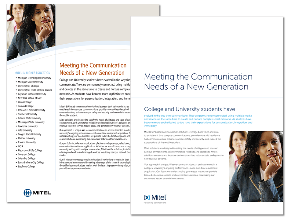 I was asked by Mitel, a global provider of business communication systems, to assist in their corporate re-branding. All documents were re-envisioned with a clean, corporate style.